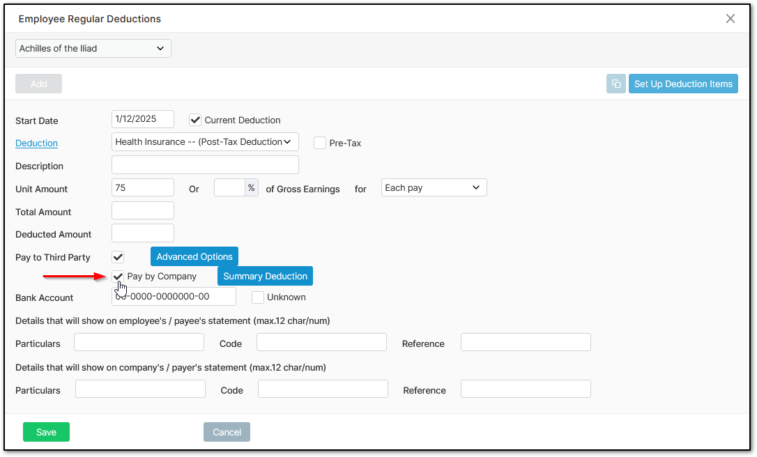 Note: If the deduction is paid to a third party and requires a unique reference, this option will not work. You must set up separate deductions.