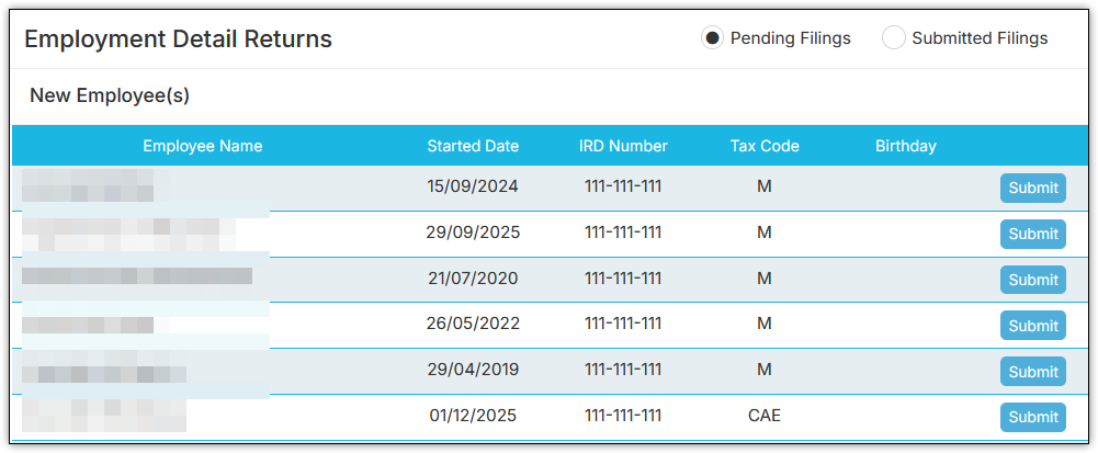 Please navigate to "Report Centre", "IRD Filing", and "Employment Detail Returns". None of the information here will submit automatically to the IRD. If you enter into this page for the first time, you may be slightly overwhelmed by the information you need to submit, but do not be alarmed as you will not receive penalties for not submitting this information.