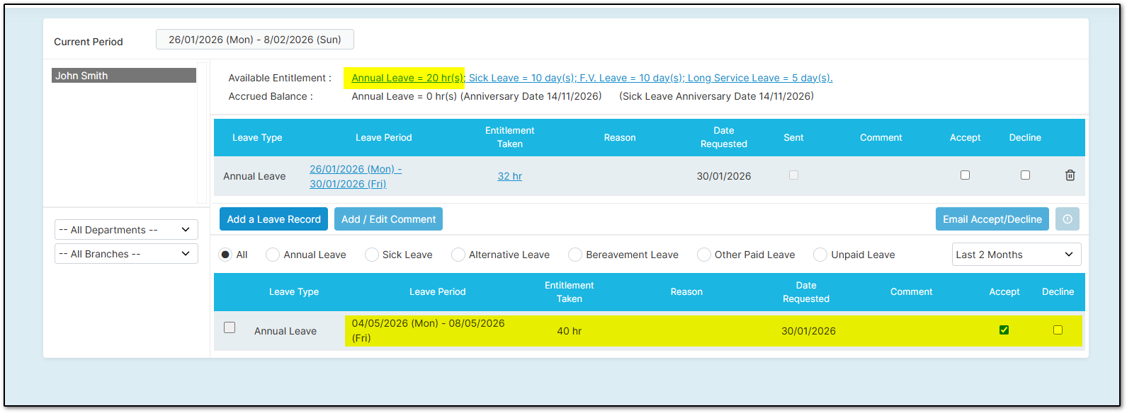 This totals 32 hours of leave, however it appears the employee only has 20 hours of annual leave available.