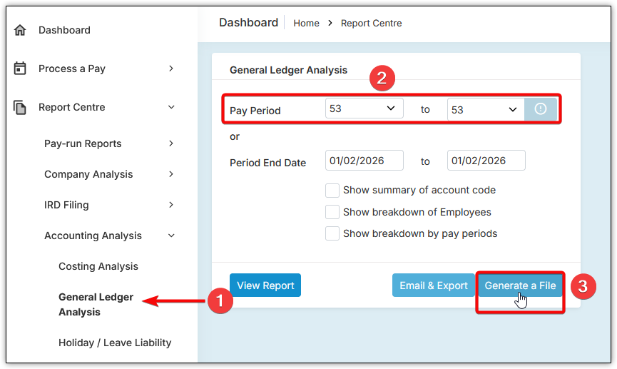 1. Head to "Report Centre", "Accounting Analysis", "General Ledger Analysis".