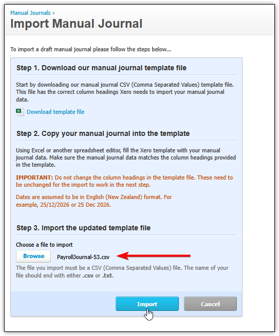6. Under "Step 3", choose the file you generated from Crystal Payroll and select "Import".
