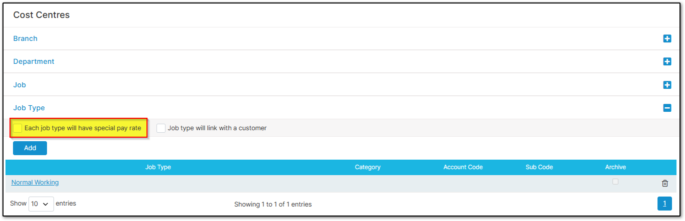 Navigate over to "Company Settings", "Cost Centres". Open "Job Type". If you would like to set up a specific pay rate for the job, you can enable "Each job type will have special pay rate".