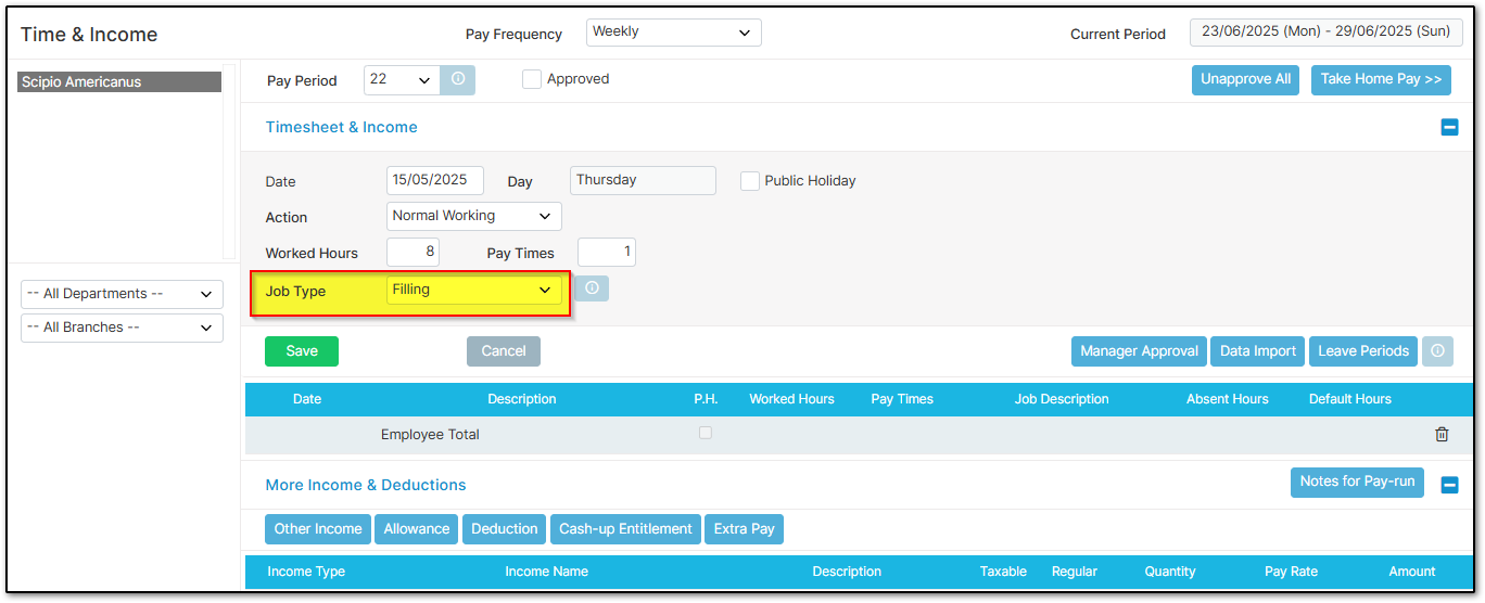 Once configured, you will be able to enter "Job Types" into employees' timesheets.
