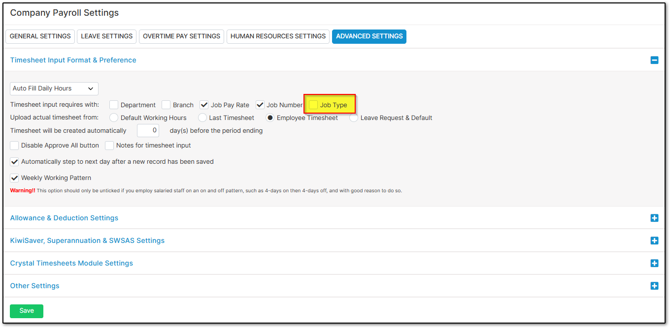 Navigate over to "Company Settings", "Payroll Settings". Open "Advanced Settings". Under "Timesheet Input & Preference" enable "Job Type". Select "Save".
