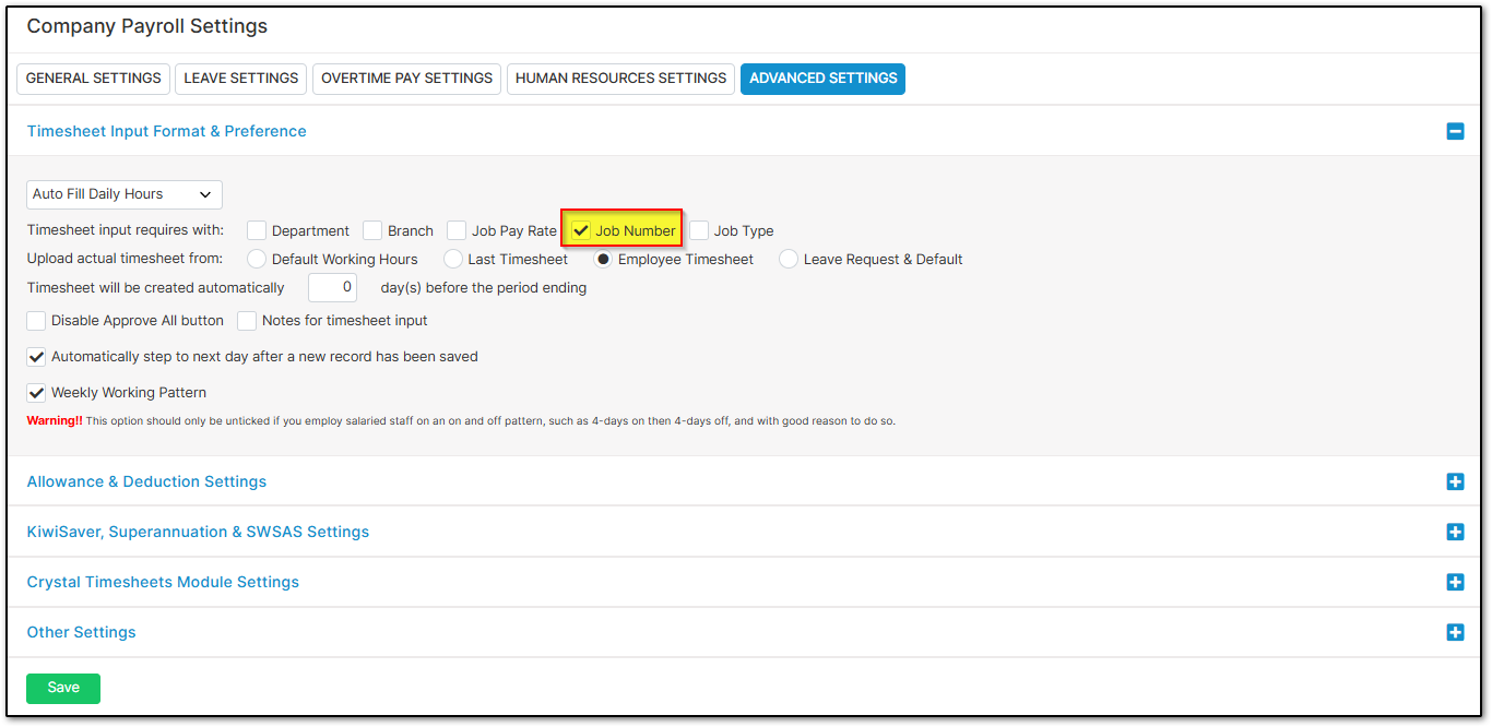 Navigate over to "Company Settings", "Payroll Settings". Open "Advanced Settings". Under "Timesheet Input & Preference" enable "Job Number". Select "Save".